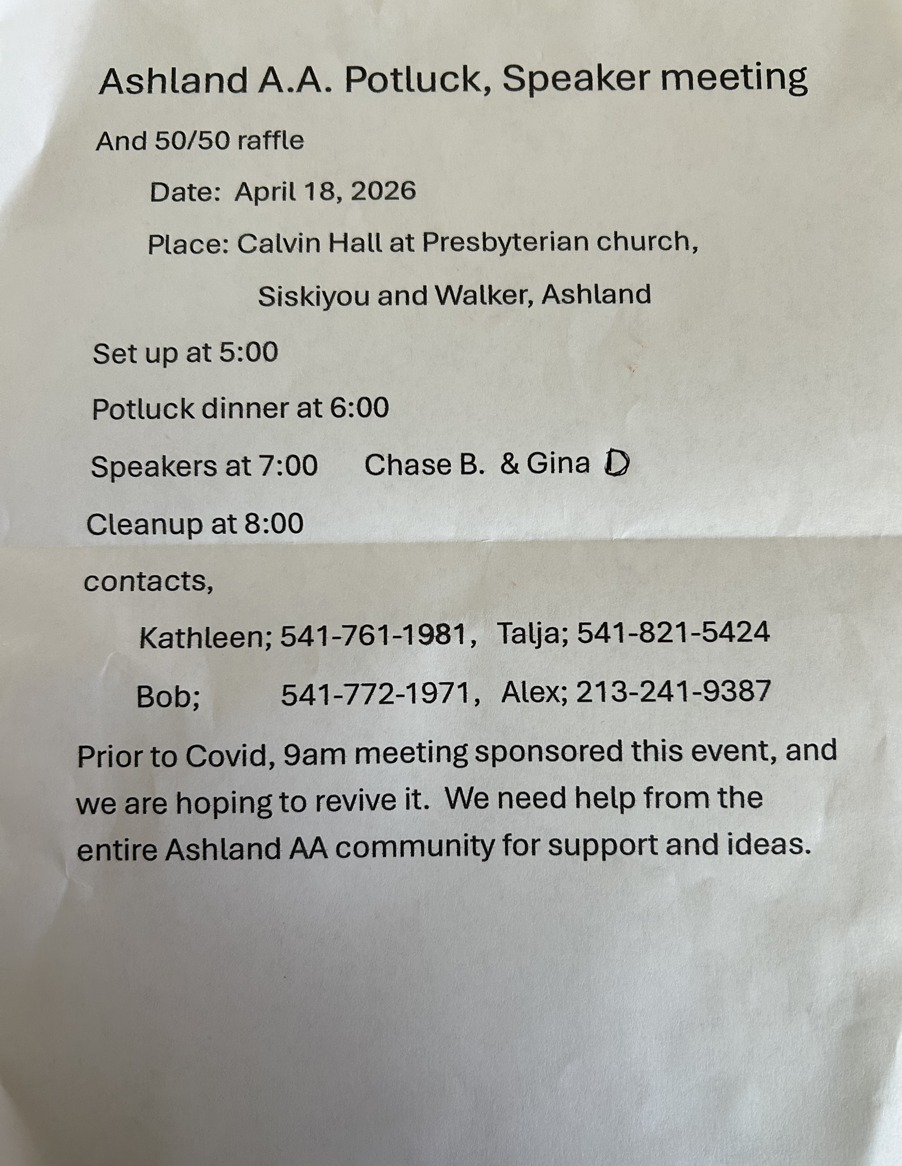 Crack of Dawn sponsored. Potluck dinner served at 6 with a speaker at 7pm. Asking for Ashland AA Community support and ideas.
