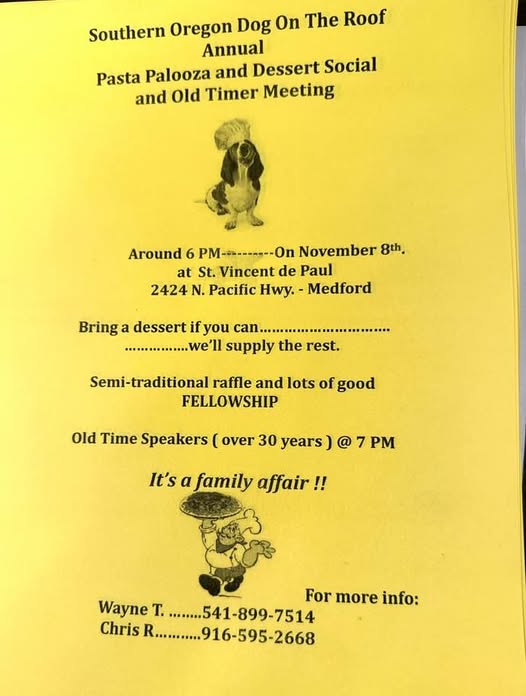 Pasta Palooza, Dessert Social, Old Timer Meeting. Bring a dessert if you can, we will supply the rest. Semi-Traditional Raffle!!